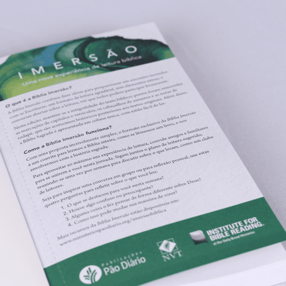 A série IMERSÃO está organizada em seis volumes, com o texto da Bíblia Sagrada, Nova Versão Transformadora (NVT), uma tradução clara e fiel das Escrituras em português contemporâneo.