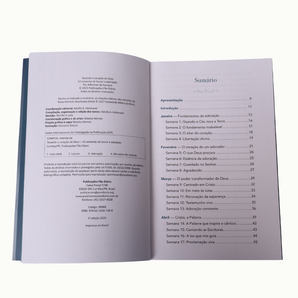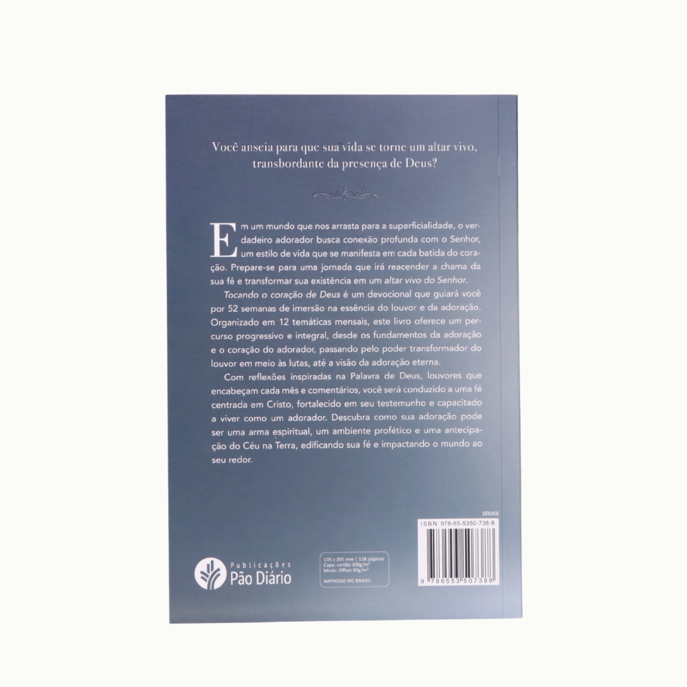 O livro Tocando o coração de Deus é um devocional especial, dividido em 52 semanas e 12 temáticas mensais, que conduz o leitor a uma imersão profunda na essência do louvor e da adoração.