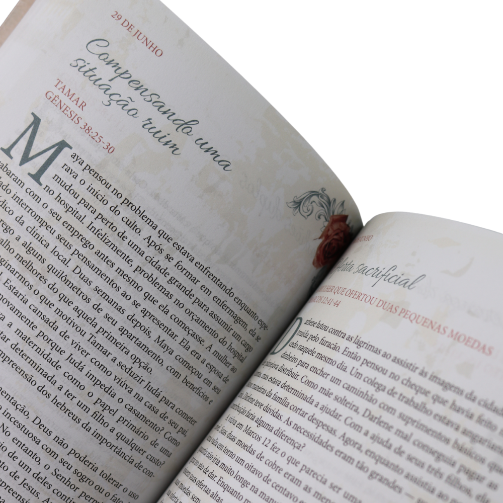 Para atender às suas preferências e necessidades, “Um Ano com as Mulheres da Bíblia” está disponível em duas belíssimas opções de acabamento, ambas projetadas para acompanhar você nesta jornada de um ano: capa brochura, com orelha e capa dura, mais resistente e durável, perfeita para a mesa de cabeceira ou para ser um item de destaque em sua estante.